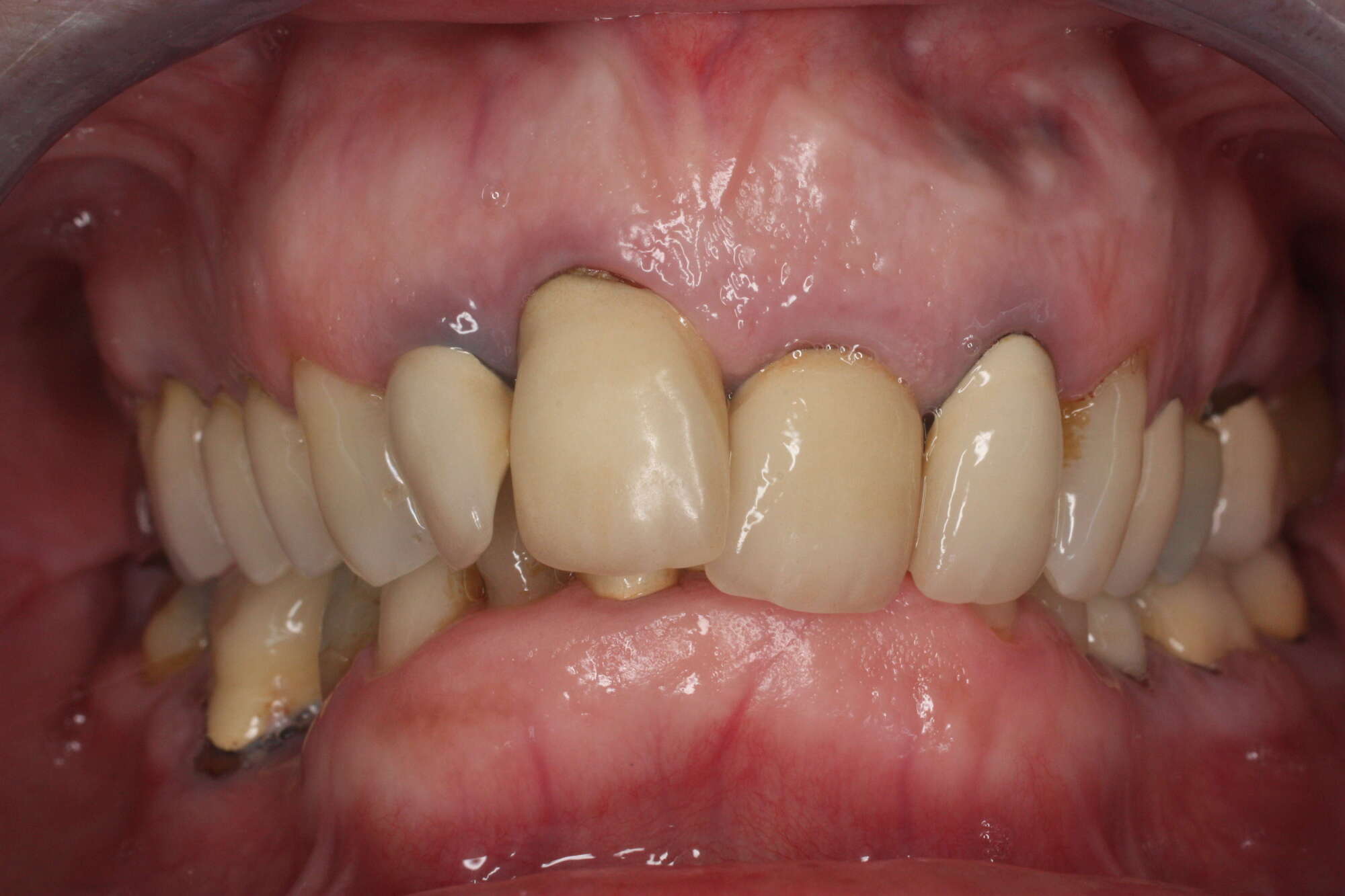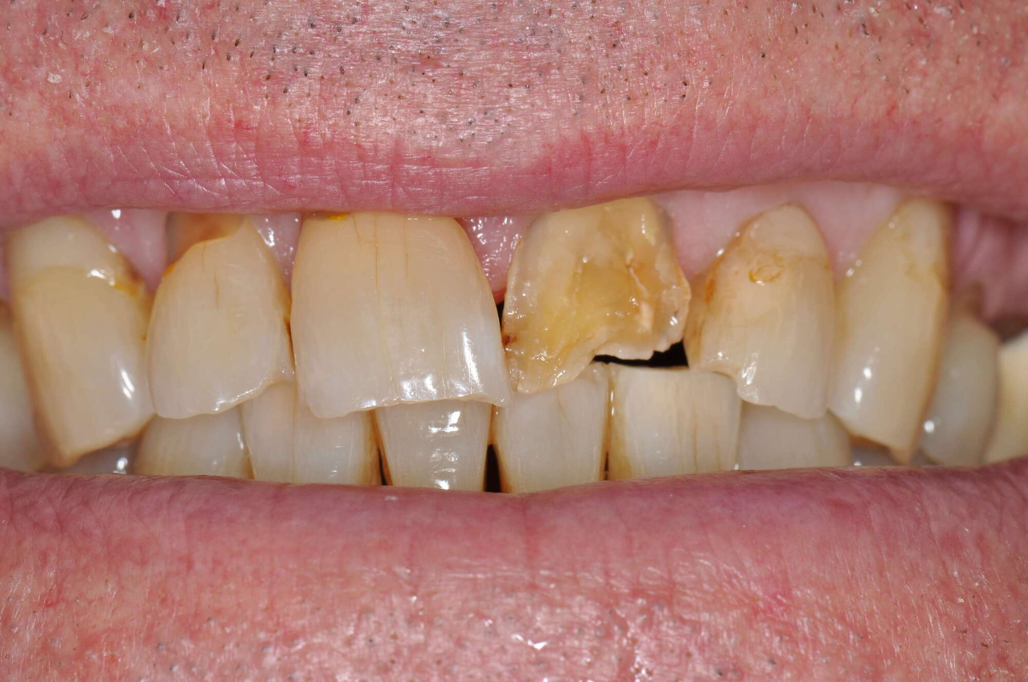 Un patient qui a négligé l'usure de ses dents car il n'avait aucune douleur s'est retrouvé subitement avec une incisive fracturée. La gêne esthétique et fonctionnelle était évidente.