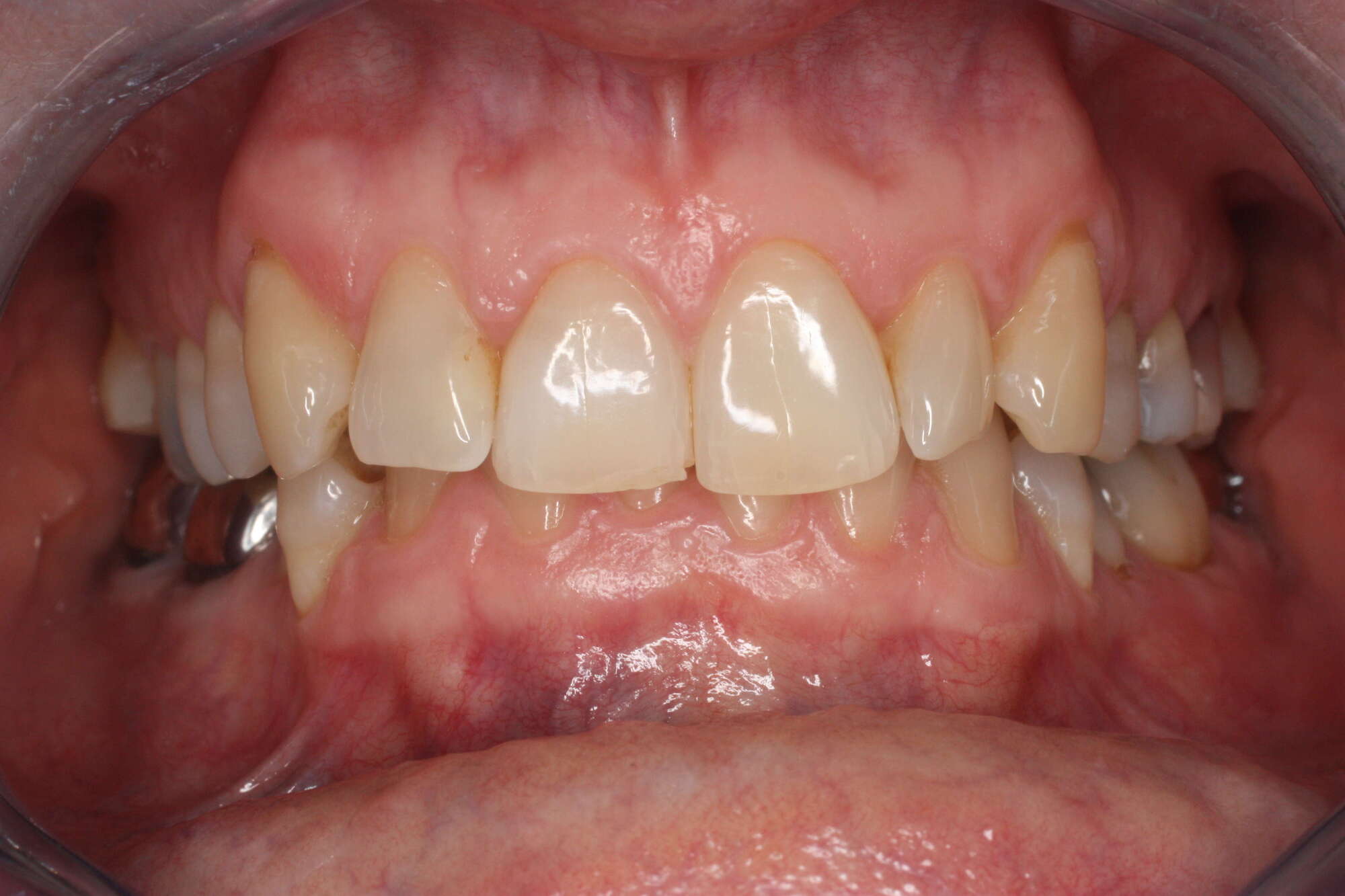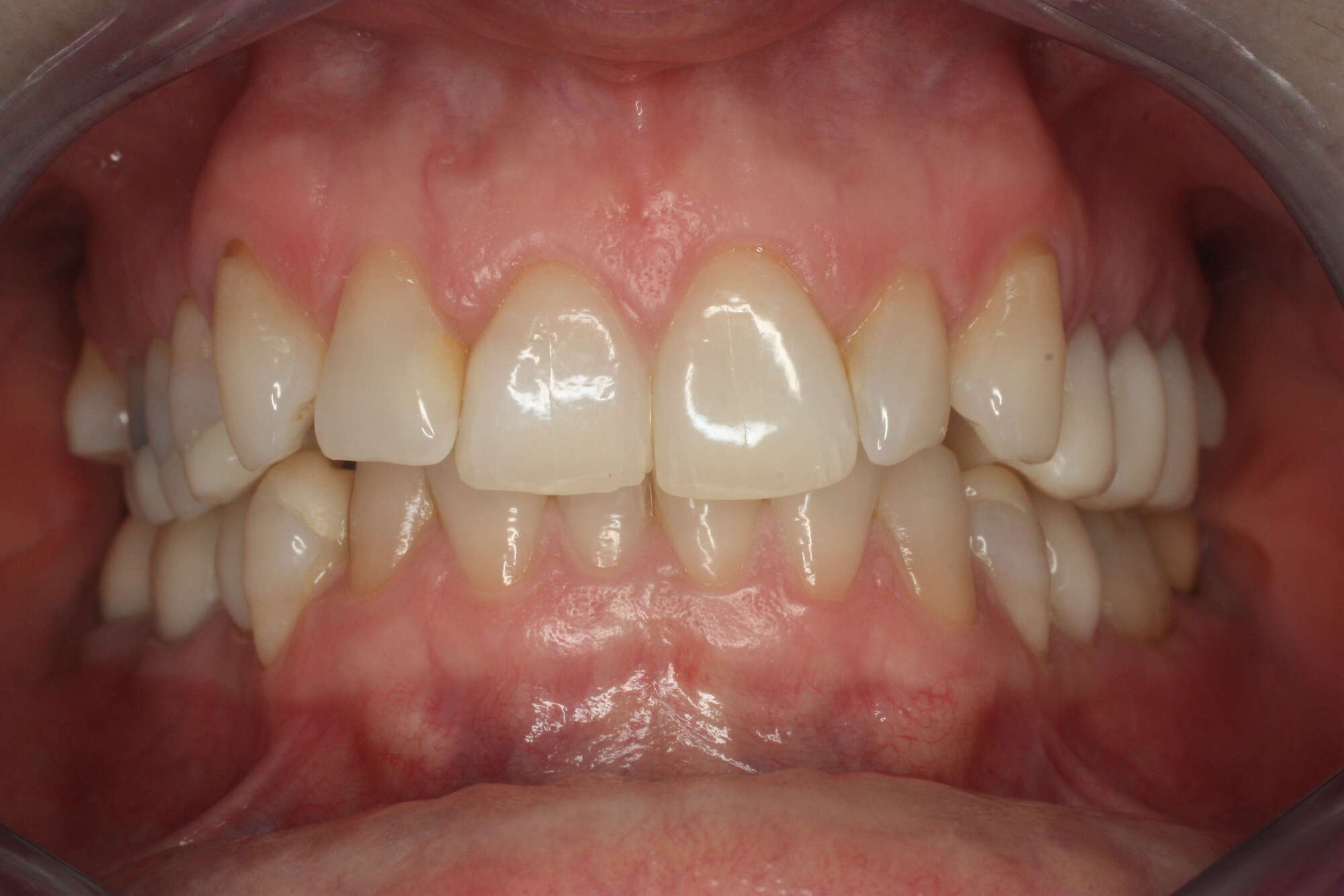 Ici la patiente présentait une occlusion de classe 2 avec un articulé très serré. En plus d'une demande esthétique, elle souhaitait "être capable de mastiquer à nouveau une entrecôte". La "seule" contrainte qu'elle nous a présentée était : "pas de chirurgie" et de réaliser les soins sous MEOPA car elle avait la phobie des soins dentaires.